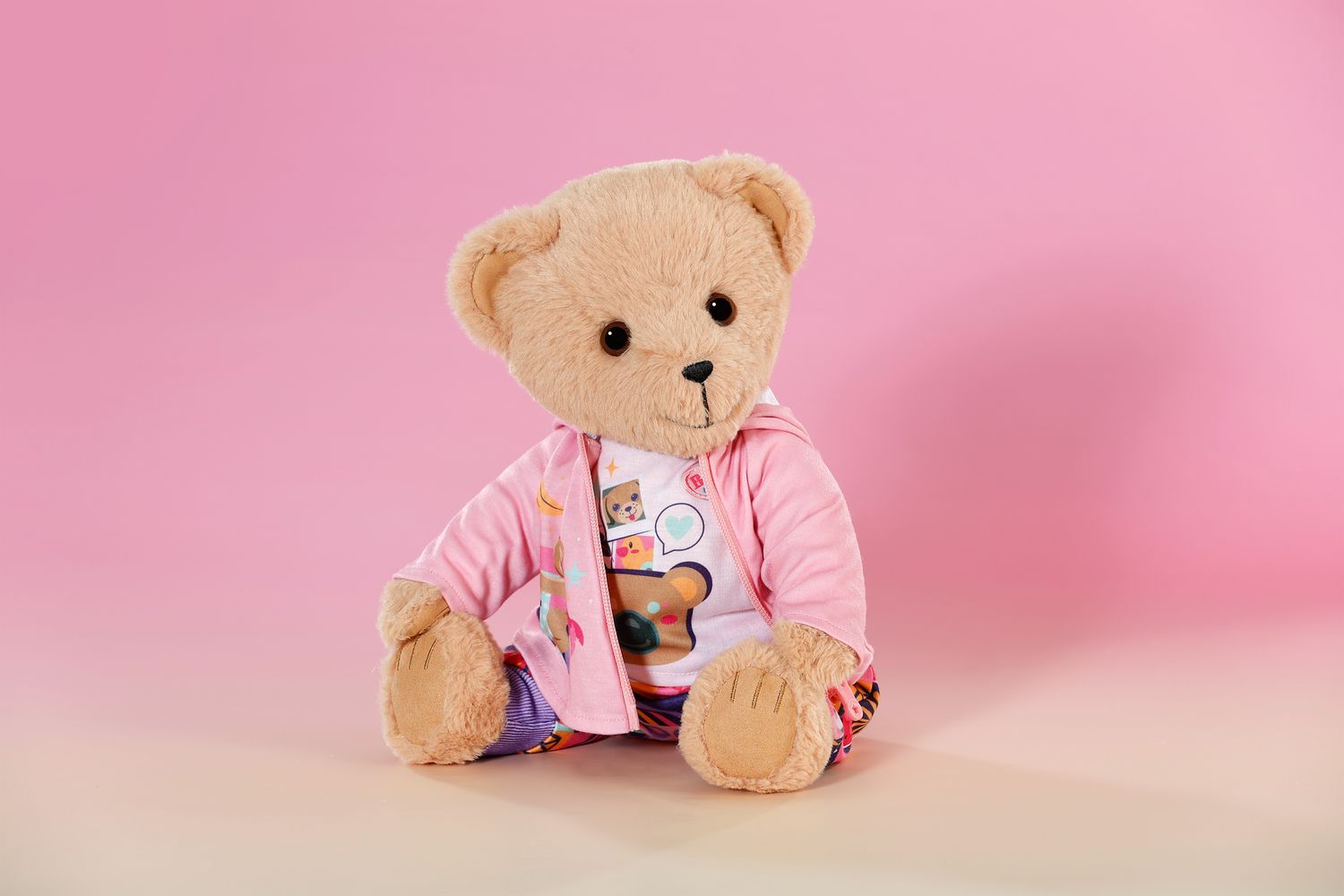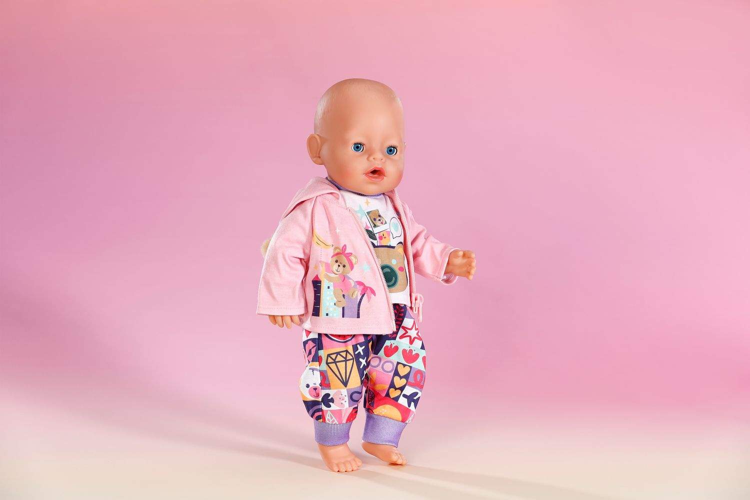 Roztomilý obleček pro miminko se skládá ze tří částí: barevných kalhot s fialovými lemy a patchworkovým vzorem ve veselých barvách, světle fialového trička s dlouhým rukávem ozdobeného obrázkem medvídka a roztomilé růžové bundy s kapucí, která má roztomilá hebká medvědí ouška. Díky tomuto outfitu je BABY born vždy krásně v teple.
