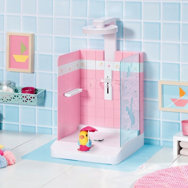 Panenka BABY born se připevní do stojánku a zábava s vodou může začít. Pootočením kačenky Berty se spustí elektronické čerpadlo a ze sprchové hlavice začne téct skutečná voda. Je libo horkou sprchu nebo ledový adrenalin? Směšovací baterie ve tvaru kačenky ukazuje imaginární teplotu vody. Mimochodem, kačenku Bertu najdete také na dlaždicích a na skleněné stěně. Díky výškově nastavitelné sprchové hlavici je sprcha vhodná i pro Starší sestřičky a Starší bratříčky BABY born. Všichni členové rodiny BABY born si pod proudem vody užívají skvělou zábavu. Díky modré podložce proti stříkající vodě pod sprchou naštěstí nehrozí žádná potopa.