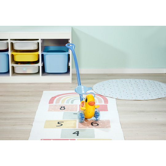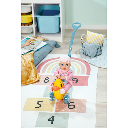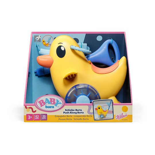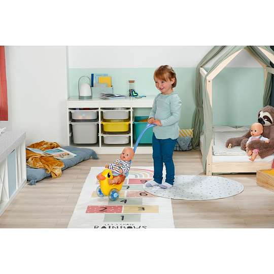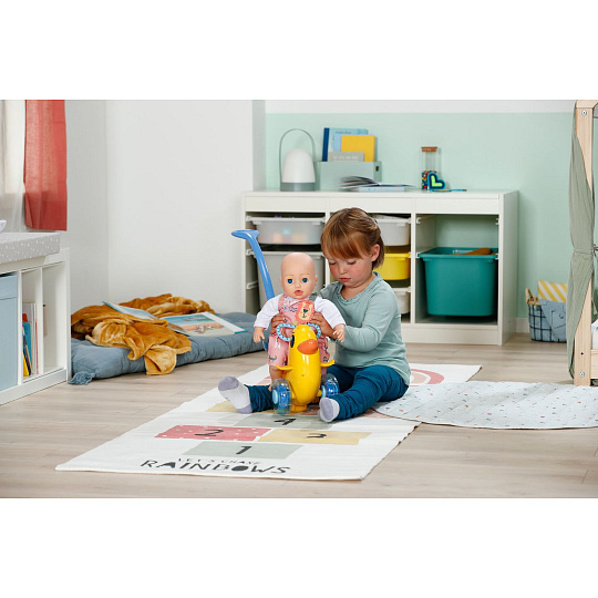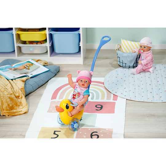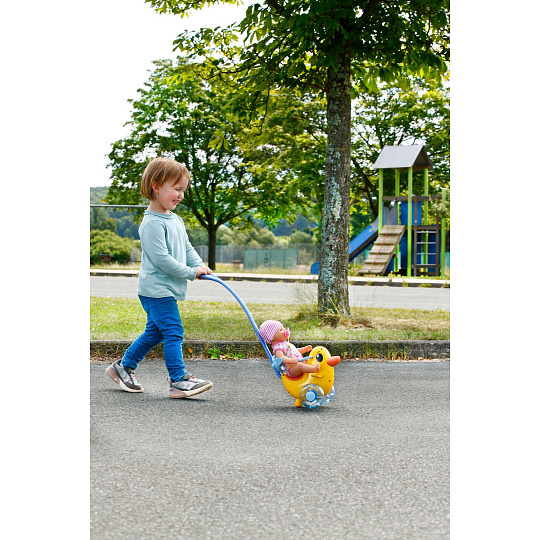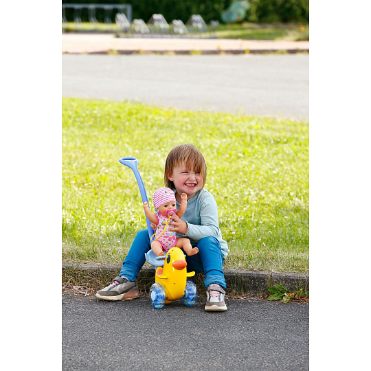 Berta je tu! Nejenže se projíždí v animovaném seriálu BABY born, ale teď dorazila i do dětského pokojíčku. Stejně jako na horské dráze může být panenka v sedátku připnuta sklopným madlem. Díky nastavitelnému opěrátku mají všechny panenky BABY born na sedátku bezpečnou oporu. Pod sedátkem se skrývá malá tajná přihrádka. Berta může být tlačena ručně po zemi nebo pomocí odnímatelné a výškově nastavitelné vodící tyče. Chrastící kolečka přidávají další herní prvek, který při projížďkách s Bertou zajišťuje ještě více zábavy – jak uvnitř, tak venku. Emma, Lena a Teddy tak mohou být vyvezeni i mimo dětský pokojíček. Tak vzhůru nasedat a jedeme!