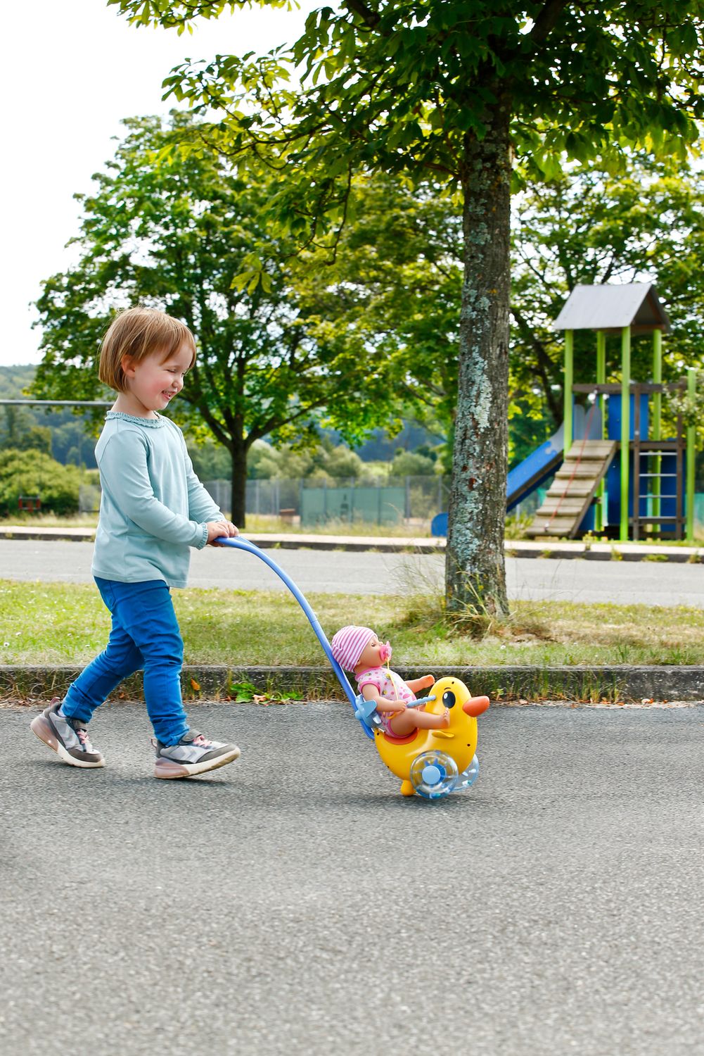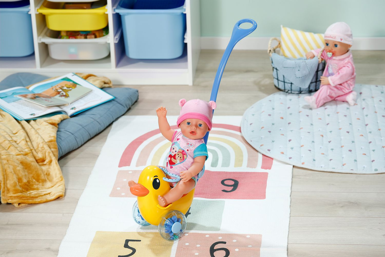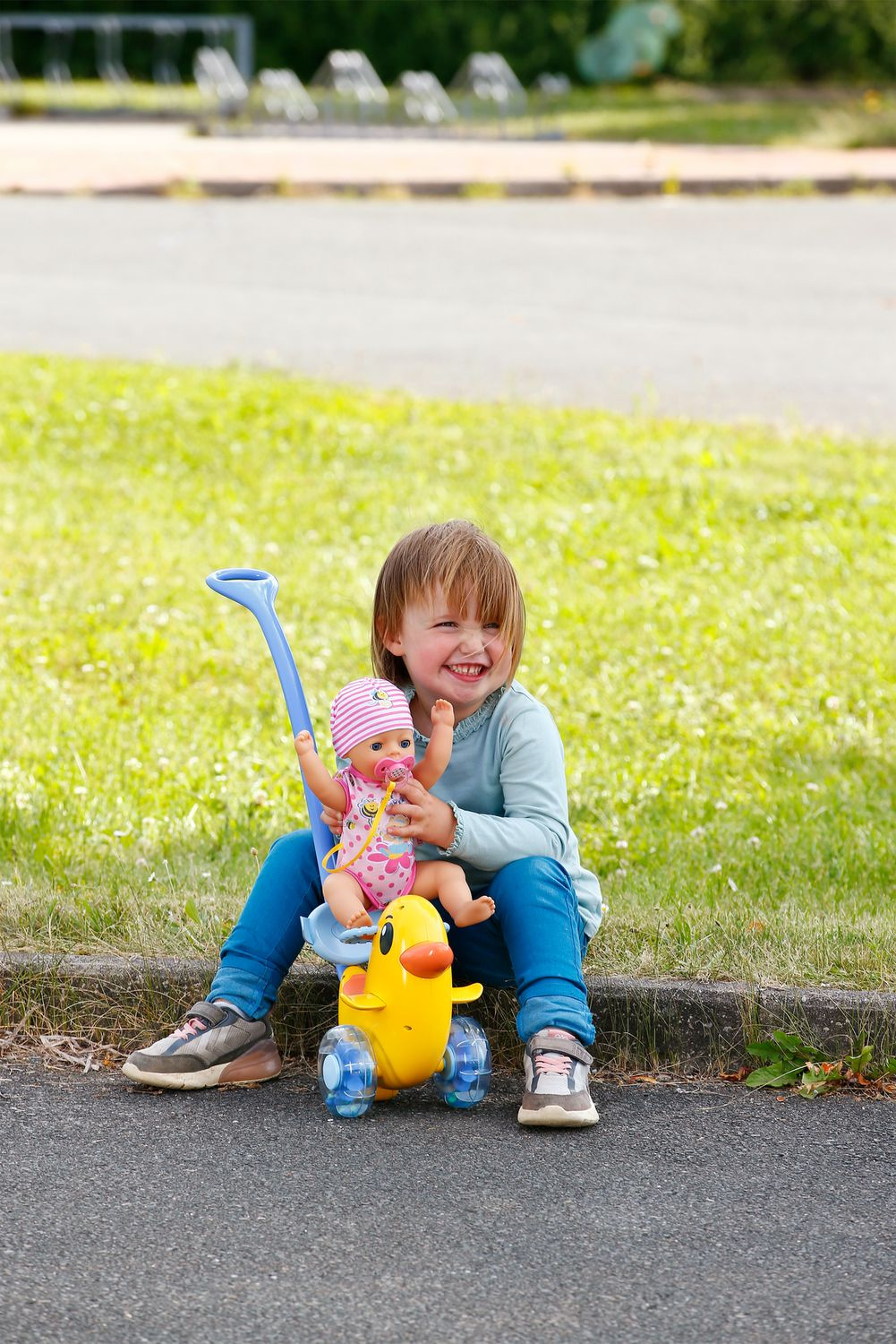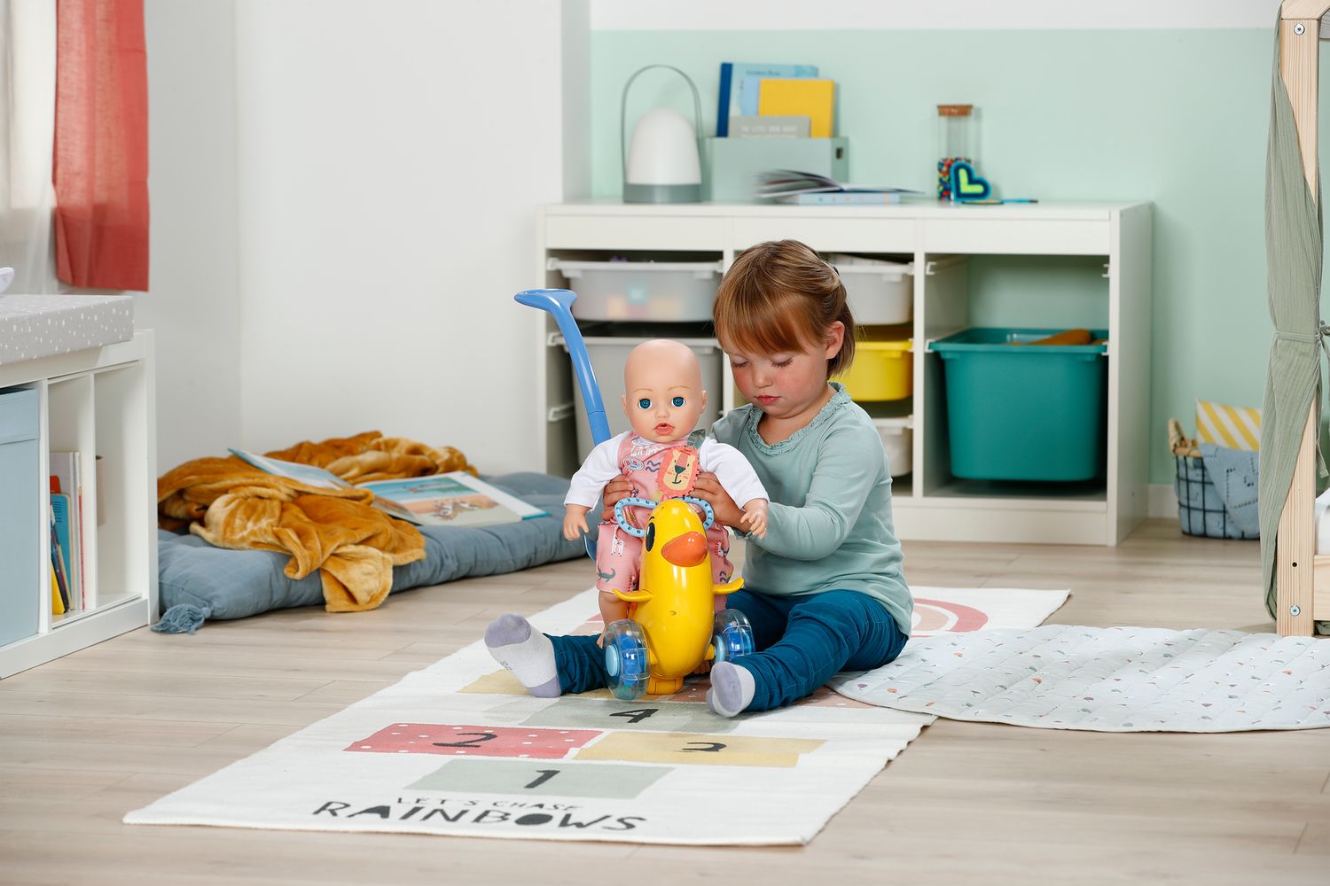 Berta je tu! Nejenže se projíždí v animovaném seriálu BABY born, ale teď dorazila i do dětského pokojíčku. Stejně jako na horské dráze může být panenka v sedátku připnuta sklopným madlem. Díky nastavitelnému opěrátku mají všechny panenky BABY born na sedátku bezpečnou oporu. Pod sedátkem se skrývá malá tajná přihrádka. Berta může být tlačena ručně po zemi nebo pomocí odnímatelné a výškově nastavitelné vodící tyče. Chrastící kolečka přidávají další herní prvek, který při projížďkách s Bertou zajišťuje ještě více zábavy – jak uvnitř, tak venku. Emma, Lena a Teddy tak mohou být vyvezeni i mimo dětský pokojíček. Tak vzhůru nasedat a jedeme!