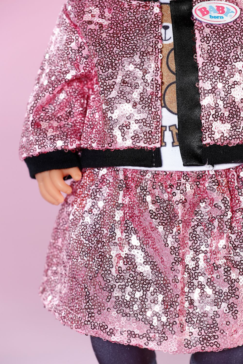 BABY born třpytivé oblečení s růžovou sukní a bundou z flitrů, tričkem s potiskem medvídka, čepicí a legínami pro panenky velikosti 43 cm.
