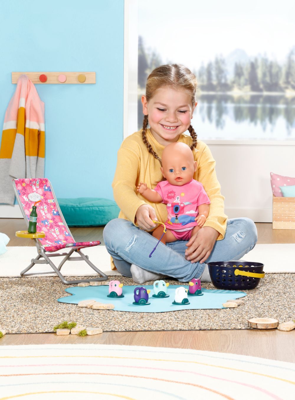 „V moři je ryb mnohem víc…“ Ale BABY born raději chytá roztomilá káčátka. Zatímco pohodlně sedí v růžovém lehátku s barevným vzorem, snaží se na háček udičky chytit jednu z pěti kačenek. Tu a tam si usrkne limonádu, kterou má položenou na žlutém stolku u lehátka. Když vyloví všechny kačenky a má je uloženy v modrém koši, vrátí je zpátky do rybníka a zábavná hra může začít znovu. Na tuto hru na rybaření si BABY born oblékla ležérní dlouhé růžové tričko s roztomilým potiskem.