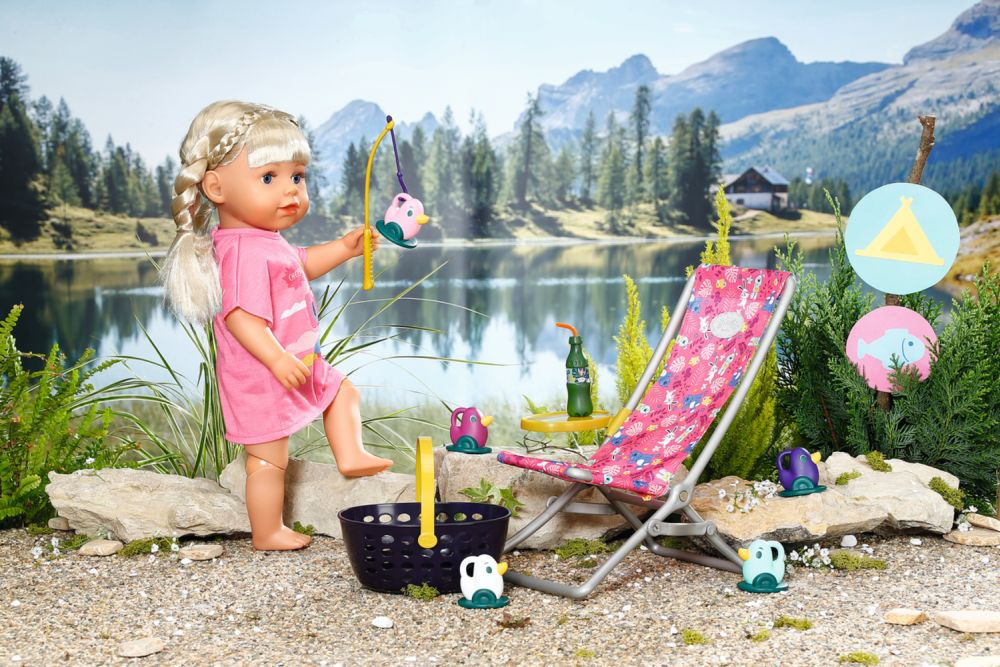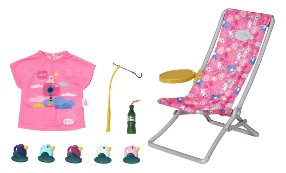 BABY born Víkendová souprava na rybaření obsahuje obleček, lehátko se stolkem, láhev s limonádou, košík, 5 kačenek a rybářský prut.