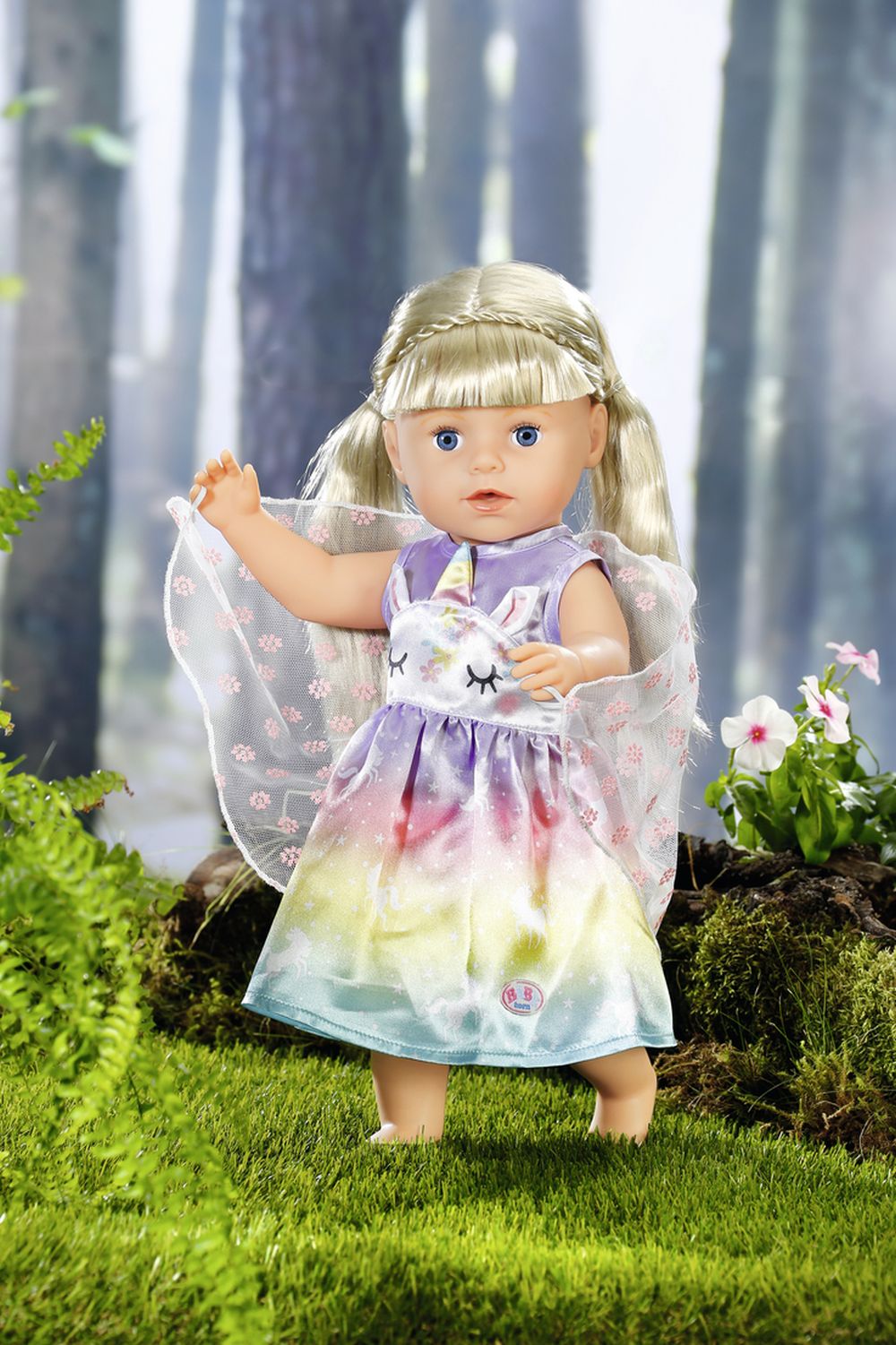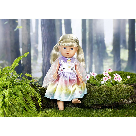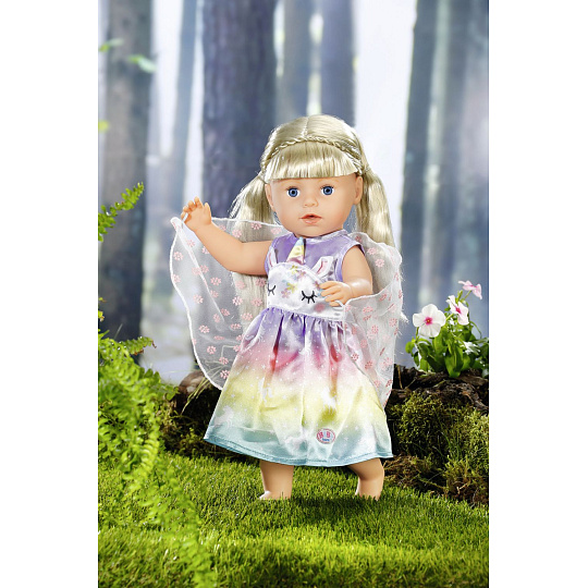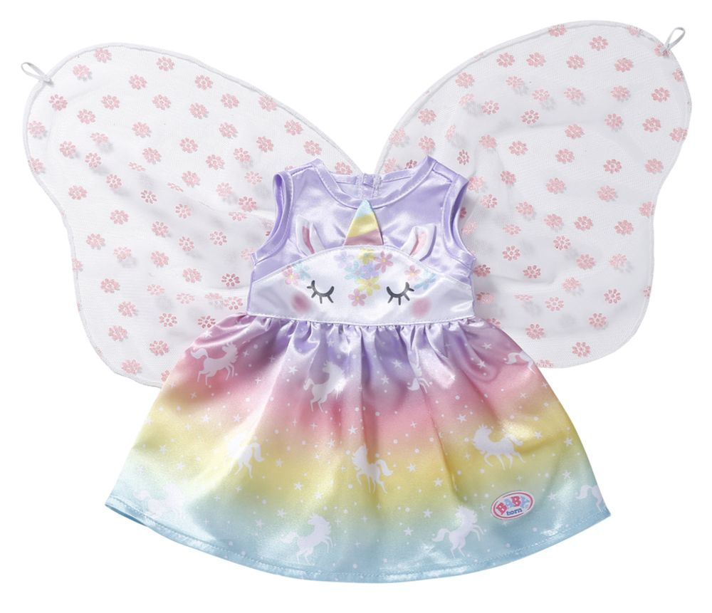 Víly a jednorožci k sobě patří stejně jako mléko a sušenky. Vílí šatičky pro panenku BABY born jsou ušity z nádherné duhové látky. Sukýnka je potištěna kouzelnými jednorožci tančícími po hvězdné obloze. Horní část šatiček je vepředu ozdobena obličejem jednorožce s našitými oušky a barevným rohem. Správná víla musí mít samozřejmě i křidélka. Průhledná křidélka s třpytivými kytičkami jsou všita do zadní části šatiček a jakmile BABY born prostrčí ruku malým očkem v horní části křidélek, otevřou se.