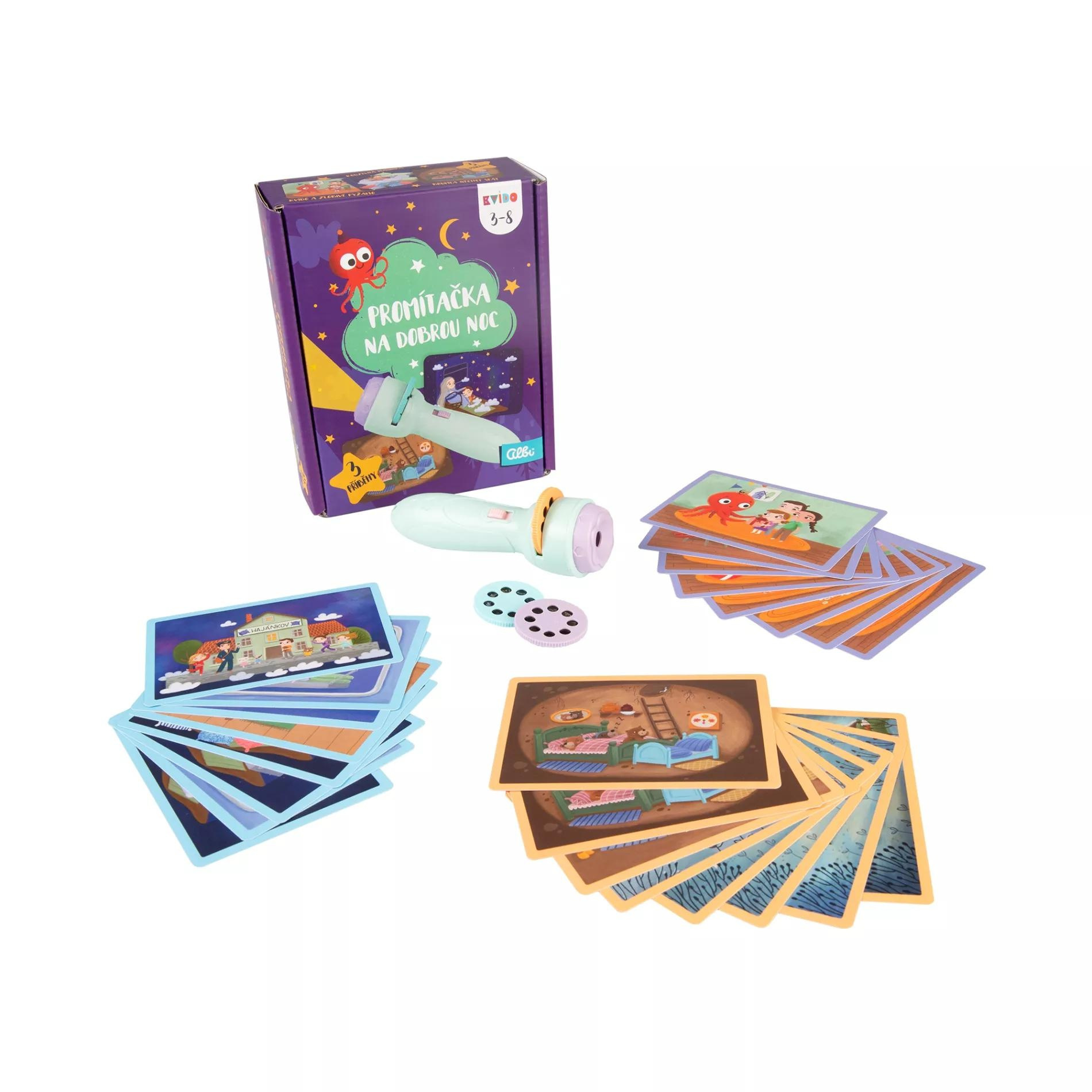 Sada obsahuje 3 obrázkové kotoučky, které se vkládají do promítací svítilny a jejich přetáčením můžete na zdi sledovat pohádku na dobrou noc. Každý příběh se odehrává na 8 obrázcích. Ilustrace najdete i na přiložených kartách společně s celým textem příběhu.