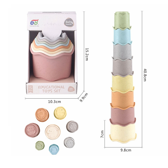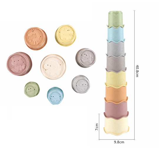 Oblíbená věž vhodná pro hraní na písku, ve vaně nebo doma na podlaze. Kelímky může dítko stavět na sebe nebo vkládat do sebe.