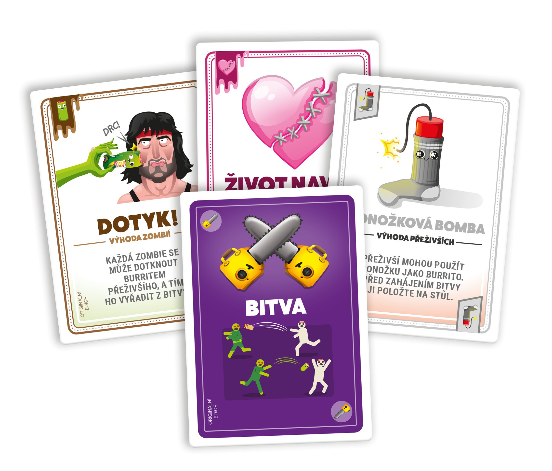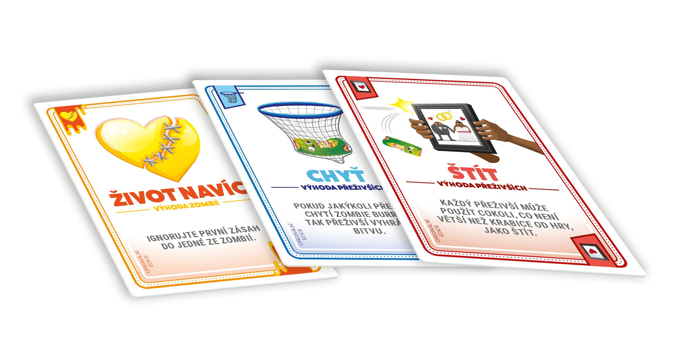Ve hře existují 3 typy karet – výhody přeživších, výhody zombií a karty bitev. První dva zmíněné typy karet mají speciální efekty, které týmům dávají různé výhody v bitvě nebo jim je naopak odstraní. Karty bitvy pak spouští to, na co se všichni tak těší! POŘÁDNOU BITVU! Důležité je promyslet plán, komunikovat se svým týmem o vašich kartách a ideálně načasovat bitvu.
