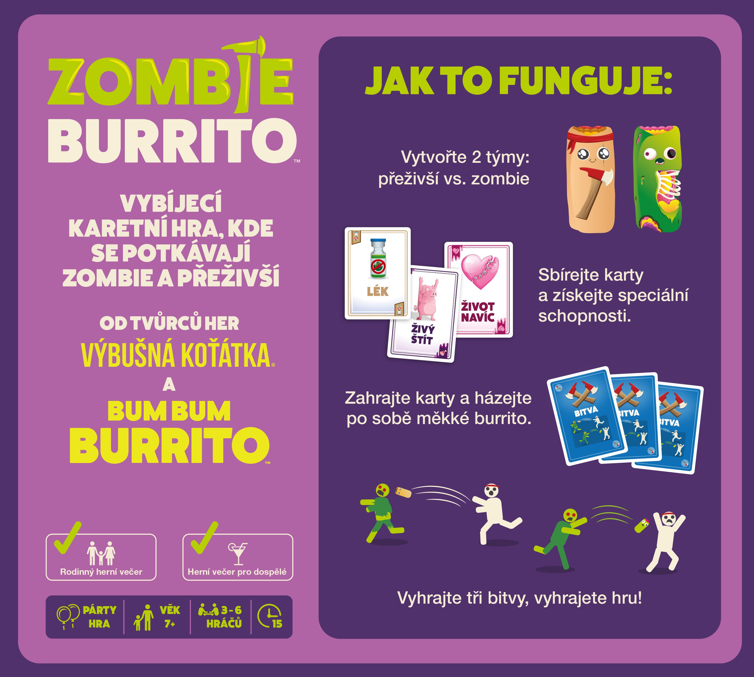 Už vás unavuje, jak vám děti ve škole stále schovávají svačinu, jak vás šéf v práci šikanuje, protože máte rádi jednorožce, jak vám maminka i ve vaší dospělosti stokrát připomíná, že se máte přiobléknout, a přitom se potíte jako kuře ve vlastní šťávě? Je čas se na někom vyřádit! Ve hře Zombie Burrito má každý tým jednoduchý cíl: vyhrát bitvu tím, že soupeře zasáhne měkkým burritem.