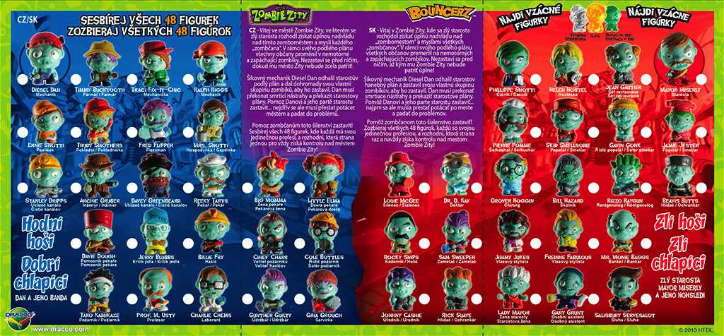 Nová sběratelská kolekce Zombie Zity Bouncerz bude obsahovat 48 gumových skákajících postaviček. Sbírka je obohacena o zcela speciální figurky: zlaté, stříbrné a svítící ve tmě. Díky jedinečným vlastnostem s nimi můžete zažít ještě více legrace a zkusit si zahrát jednu ze zábavných her, ke kterým najdete návod uvnitř balení.