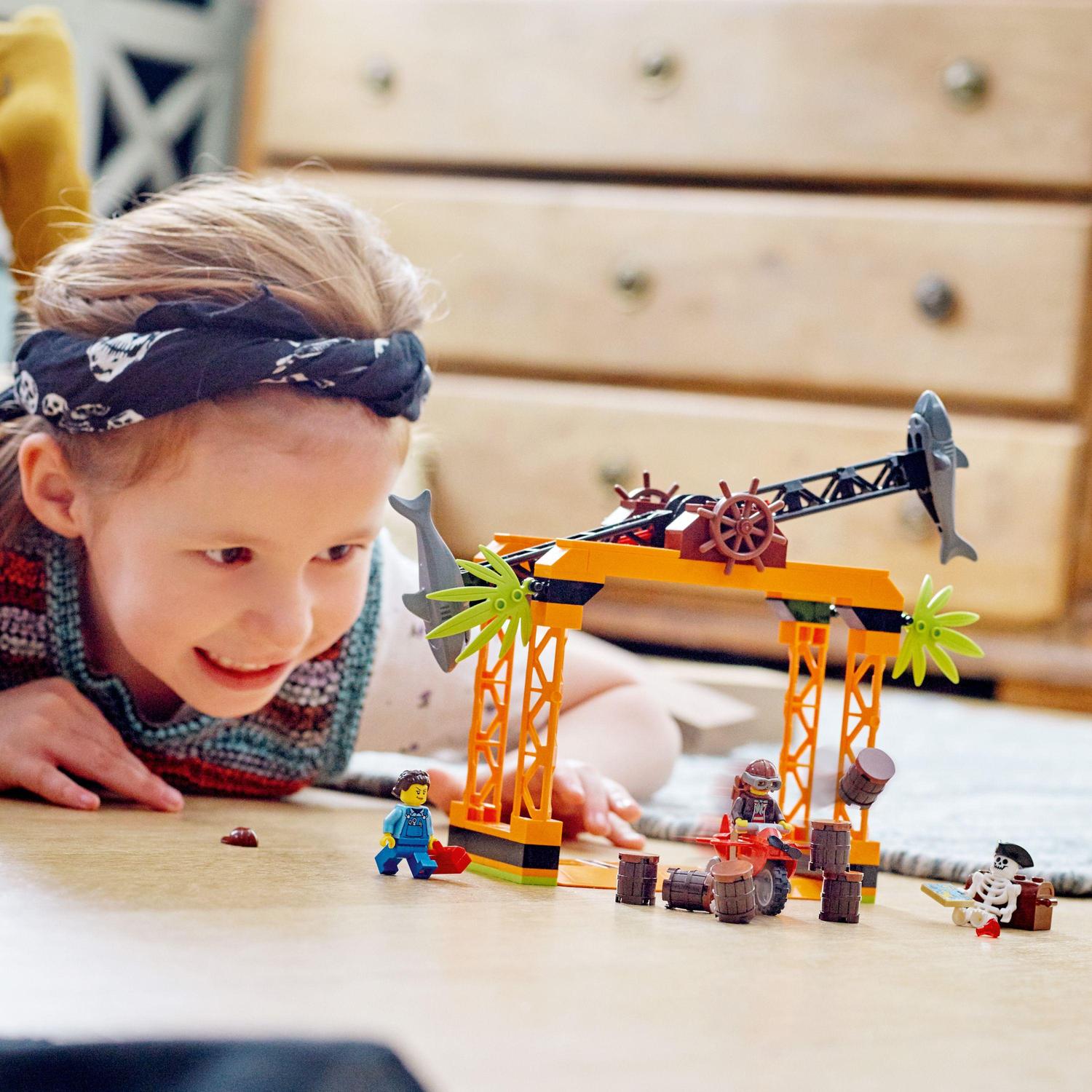 Povzneste hraní na novou úroveň s akční stavebnicí LEGO® City Žraločí kaskadérská výzva (60342). Úkolem dětí je aktivovat motorku se setrvačníkem a vyhnout se kostlivci a točícímu se kolu se žraloky, převrhnout barely a získat truhlu s pirátským pokladem. O hodiny nápaditého hraní se postarají 2 minifigurky, včetně postavy Chucka D. Goldberga ze seriálu LEGO City.