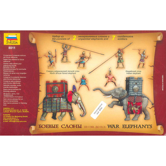 Tato sada obsahuje dva slony – indického a afrického – a také jejich vodiče a vojáky. Alexandrovy armády se se slony poprvé setkaly, když zaútočily na vojsko indického císaře. Typické bojové věže potom poprvé použil Pyrrhos, král épeirský. Od té doby přijaly válečné slony s těmito věžemi do svých služeb armády téměř všech helénských národů z Evropy i Asie, včetně té římské.