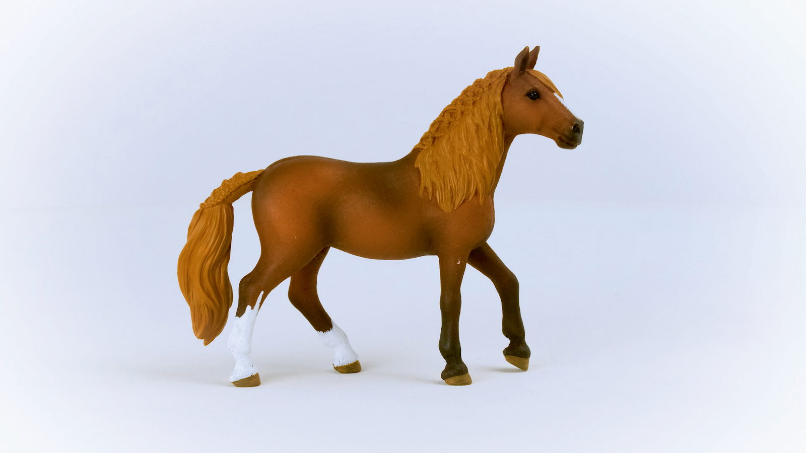 Jen sleduj, jak se tenhle hrdý hřebec plemene peruánský paso prohání po zahradě! Se svou bujnou hřívou a elegantně prohnutým krkem přitahuje pozornost všech. Pozorně střihá svýma hezkýma ušima. Možná čeká, že na další přehlídce vyhraje všechna ocenění? Rozhodně na to vypadá! Může předvést svou speciální chůzi Paso Llano, kterou ovládají jen koně plemene peruánský paso. Rozměry: 14x10,5x3,5cm. Vhodné pro děti od 3 let.